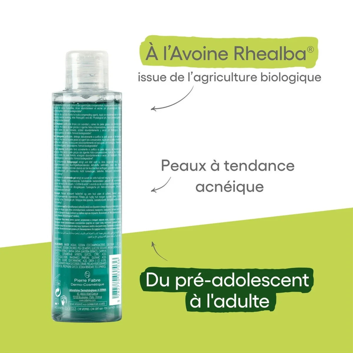Sa base lavante hydratante sans savon est Biodégradable* et composée de 86% d’ingrédients d’origine naturelle. Utilisé une à deux fois par jour, il se rince à l’eau. Sa formule au pH physiologique limite l’adhésion de C.acnes (aussi appelée P.acnes) et est riche en extrait apaisant de Plantules d’Avoine Rhealba®. Le gel moussant laisse la peau nette, fraîche, matifiée et apaisée, la peau à tendance acnéique est purifiée tout en douceur. Non comédogène.Avoine Rhealba® issue de l’agriculture biologique.Info Vegan : sans ingrédient d’origine animale.* OECD 301B.