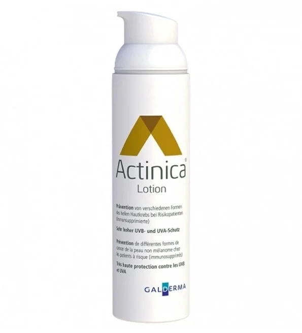 Actinica Lotion SPF50+ est un dispositif médical pour la prévention de différentes formes du cancer de la peau non mélanome chez les patients à risque (immunosupprimés). Il s’agit d’une très haute protection contre les UV.