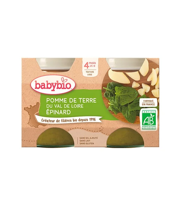 Petits pots Pomme de terre du Val de Loire et Epinard. Dès 4 mois. Ingrédients issus de l’agriculture biologique. Contenance : 2 x 130g