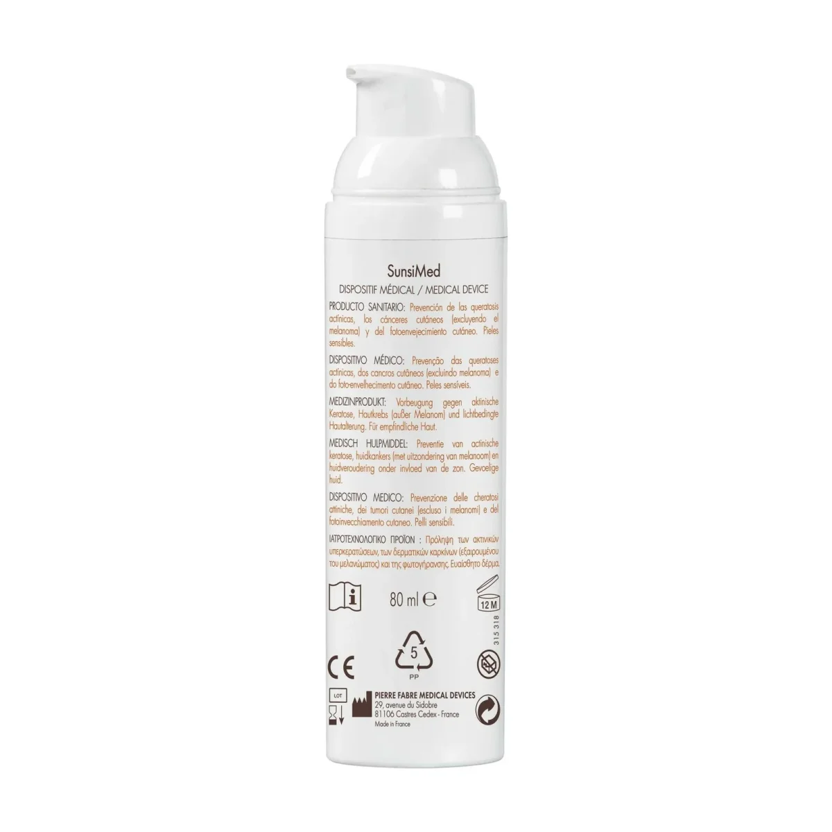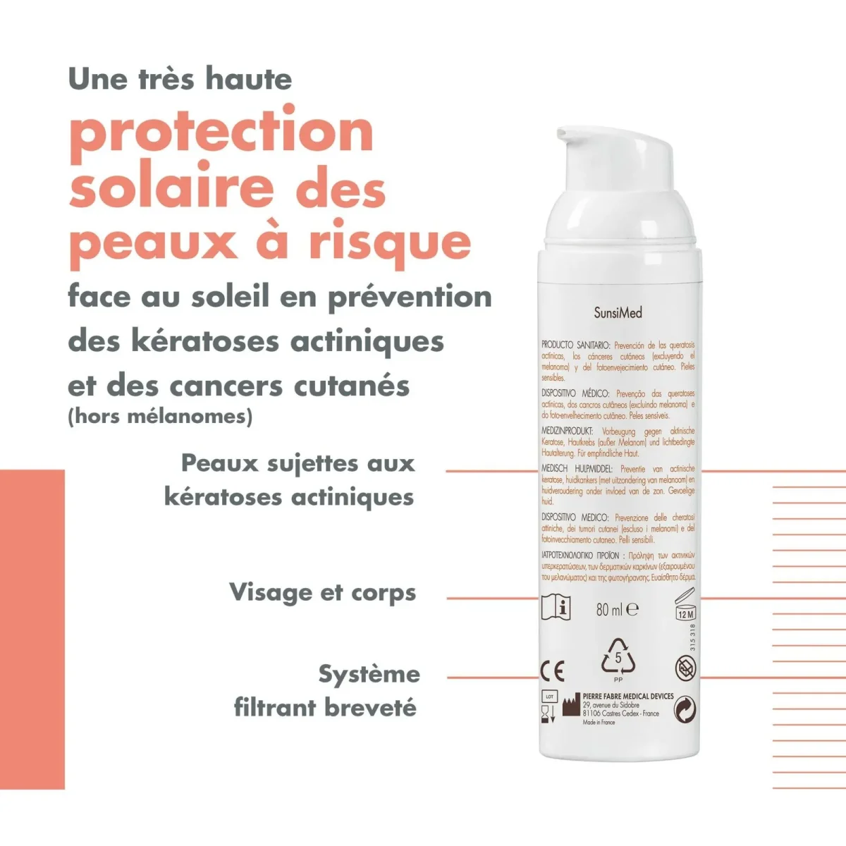 Il s’utilise en prévention des kératoses actiniques, des cancers cutanés (hors mélanomes) et du photovieillissement cutané. Grâce à son complexe protecteur exclusif issu de la Recherche Pierre Fabre, SunsiMed, Dispositif Médical de classe I, protège la peau au quotidien face au rayonnement solaire.