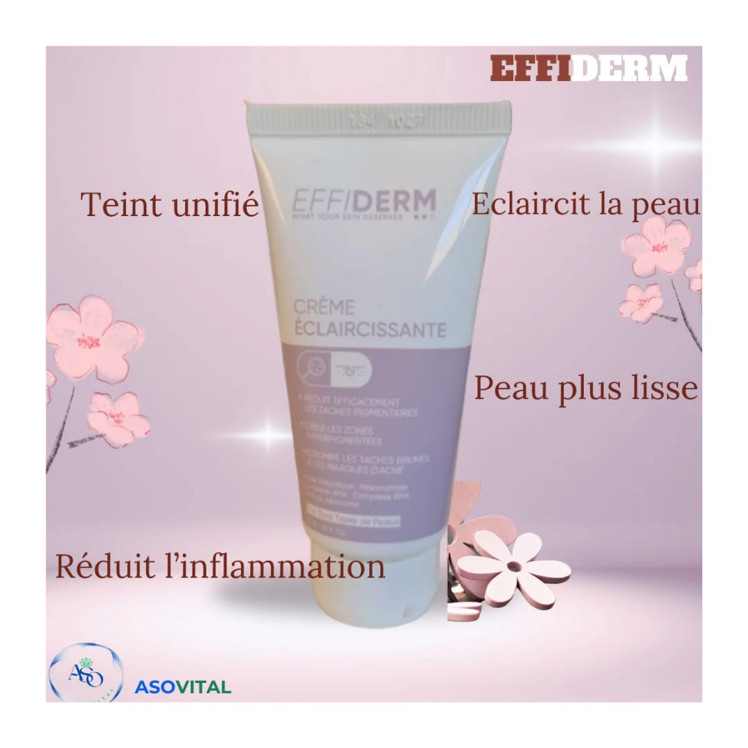 Effiderm Crème Éclaircissante 50ml unifie le teint, atténue les taches pigmentaires et redonne éclat et luminosité à la peau.