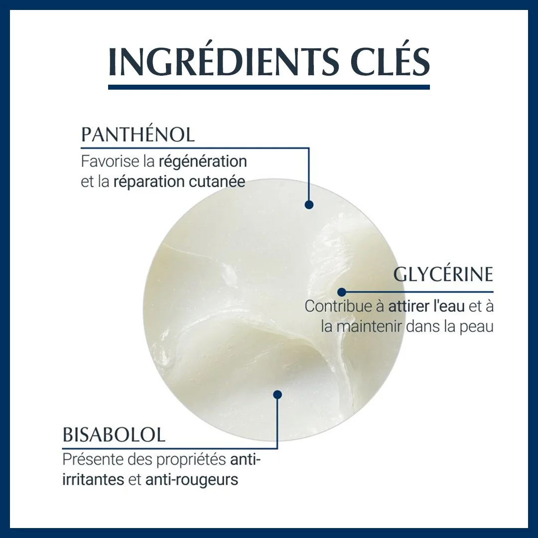 Le baume contient des ingrédients clés : la Glycérine, le Panthénol et le Bisabolol. La Glycérine est un hydratant efficace qui attire l’eau et la retient dans la peau pour une hydratation longue durée. Le Panthénol aide à accélérer la régénération et la réparation de la peau tout en l’hydratant. Enfin, le Bisabolol, qui possède des propriétés anti-irritantes et anti-inflammatoires, apaise la peau sèche et irritée. Ensemble, ces ingrédients forment une formule puissante pour apaiser la sécheresse et l’irritation de la peau.