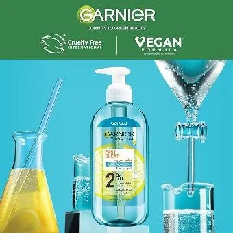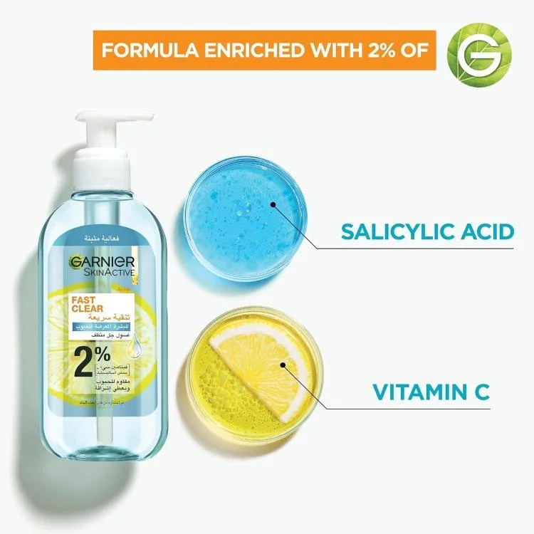 Le Fast Clear Gel Wash de Garnier forme la nouvelle génération de gel nettoyant purifiant, enrichi d’une combinaison d’acide salicylique [2%] connu pour réduire visiblement les boutons et de vitamine C, un puissant antioxydant connu pour réduire visiblement les taches brunes et éclaircir la peau.