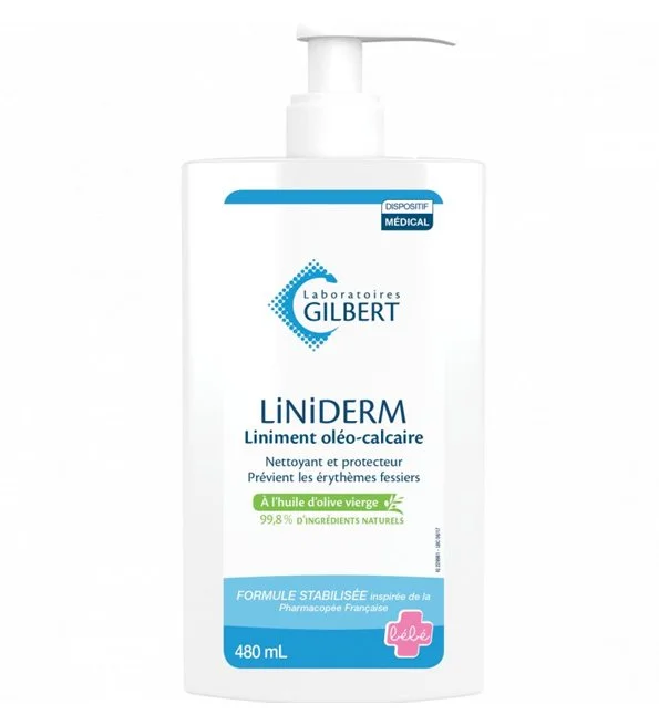 Gilbert Liniderm Liniment Oléo-Calcaire Flacon-Pompe 480 ml est un soin nettoyant et protecteur qui permet de prévenir des érythèmes fessiers. Il est formulé à 99,8% d’ingrédients naturels.