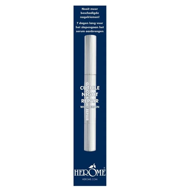 Enlever votre vernis avec le Dissolvant Soignant Herôme. Faire tourner l’extrémité du stylo et appliquer-le sur les ongles et les cuticules.