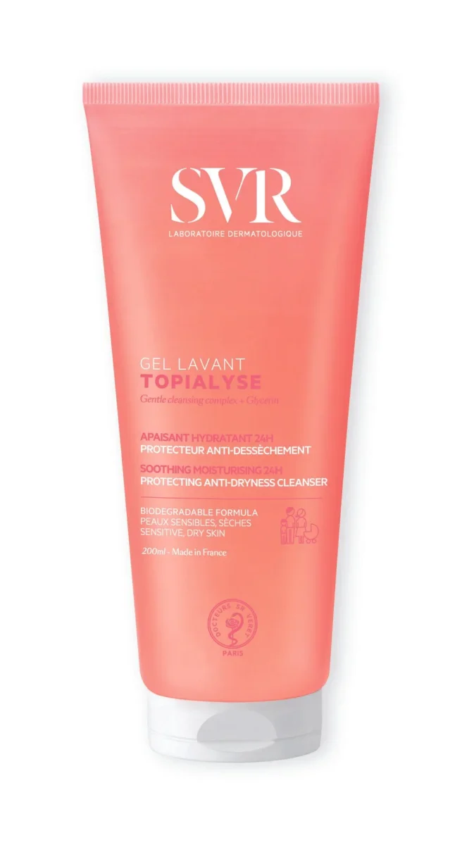 Apaisant hydratant 24h protecteur anti-dessèchement Topialyse Gel Lavant nettoie en douceur et protège de la tête aux pieds les peaux sensibles et sèches de toute la famille.