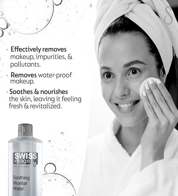 Swiss Image Essential Care Soothing Micellar Water 400 ml Un mélange doux d’extraits botaniques, spécialement formulé pour éliminer le maquillage, l’excès de sébum et les impuretés, laissant la peau pure et apaisée. Aucun rinçage ni frottement agressif requis. Type de peau : Pour peau normale à sèche.