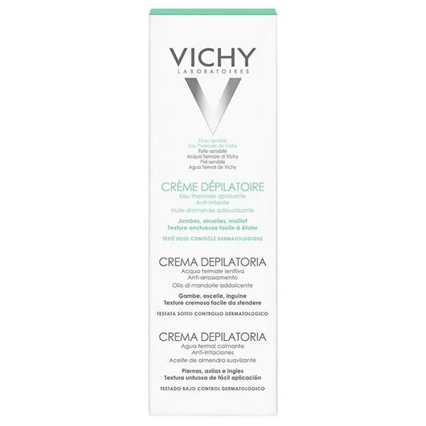 VICHY Crème Dépilatoire élimine en douceur tous les poils. Respectée pendant l’application, la peau est parfaitement nette et douce. • Besoin : Eliminer les poils | Peaux sensibles. • Ingrédients Clés : Eau Thermale de Vichy pour apaiser | Huile Végétale d’Amande pour protéger des irritations | Beurre de Karité pour hydrater. • Utilisation : Appliquer sur une peau non-irritée. Ne pas utiliser après une exposition au soleil. Faire une touche d’essai 24h avant application. Jambes, aisselles, maillot.