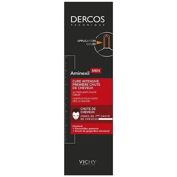 DERCOS TECHNIQUE Aminexil Men Cure Intensive Première Chute traite les premiers signes de chute pour la freiner et fortifier les cheveux à la racine. • Besoin : Chute de cheveux | Hommes. • Ingrédients Clés : Aminexil | Eperuline | Racine de Gingembre stimulante. • Sécurité : Convient au cuir chevelu sensible | Respecte le pH des cheveux. • Utilisation : Appliquer à l’aide de l’applicateur sur les golfes, le sommet du crâne, et à l’implantation des cheveux. Ne pas rincer.