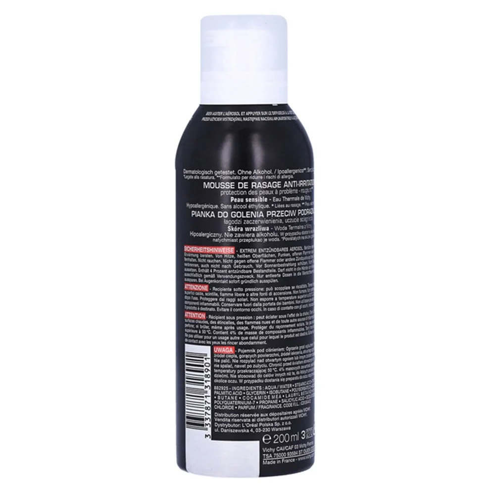 VICHY HOMME Mousse à Raser Anti-Irritations protège et assainit pour procurer une expérience de rasage simple et agréable. • Besoin : Rougeurs ou irritations post-rasage | Peaux sensibles. • Ingrédients Clés : Calcium, Vitamine C Glucosylée et Acide Salicylique pour protéger, hydrater et prévenir les échauffements et irritations. • Sécurité : Sans Alcool | Sans Parabène. • Utilisation : Appliquer sur une peau humide et nettoyée. Visage.