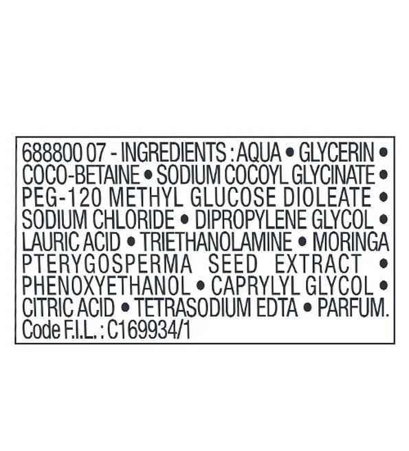 AQUA / WATER – GLYCERIN – COCO-BETAINE – SODIUM COCOYL GLYCINATE – PEG-120 METHYL GLUCOSE DIOLEATE – SODIUM CHLORIDE – DIPROPYLENE GLYCOL – LAURIC ACID – TRIETHANOLAMINE – MORINGA PTERYGOSPERMA SEED EXTRACT – PHENOXYETHANOL – CAPRYLYL GLYCOL – CITRIC ACID – TETRASODIUM EDTA – PARFUM / FRAGRANCE.