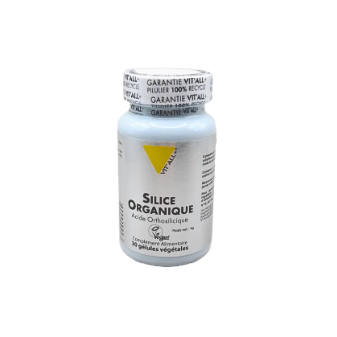 Le VIT’ALL+ Silice 100mg est un complément alimentaire à base de silice d’origine végétale, reconnu pour son rôle essentiel dans la santé des tissus conjonctifs. Il contribue à améliorer la solidité des ongles, la brillance des cheveux, l’élasticité de la peau et le confort articulaire. Présenté en boîte de 30 gélules, ce produit convient à une cure d’un mois et s’intègre facilement dans une routine bien-être naturelle, sans additifs inutiles ni OGM.